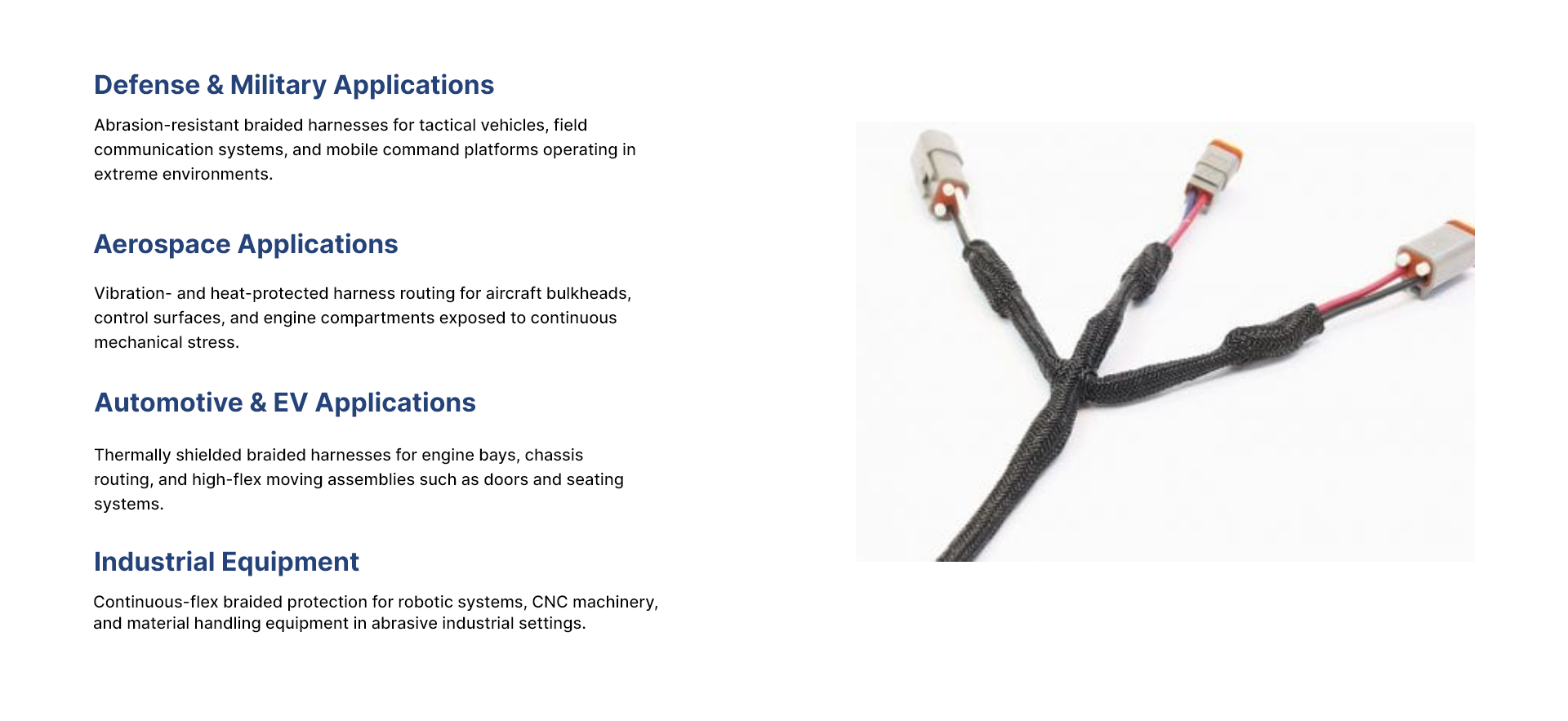 • Military and aerospace wire harnesses with MIL-SPEC compliant protective braiding