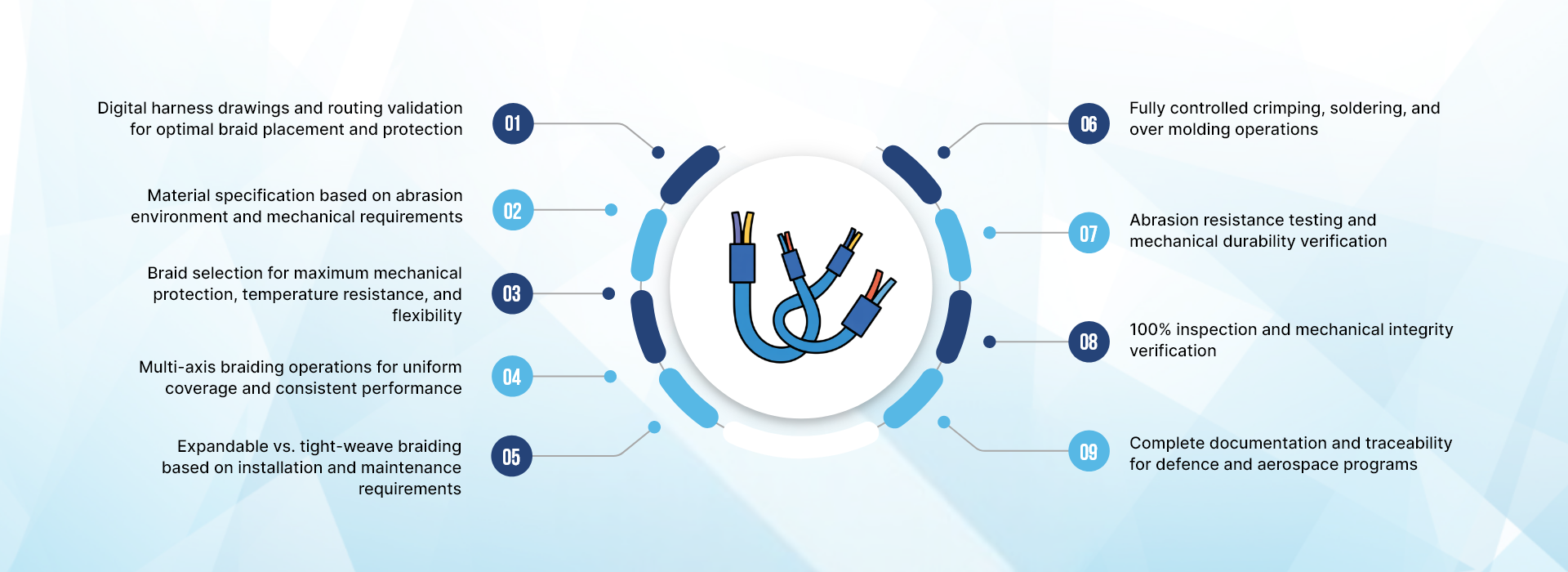 2. Flexibility & Responsiveness Our agile production model allows us to adapt quickly to changing schedules, design modifications, and urgent delivery needs a critical advantage for defense contractors and aerospace OEMs managing dynamic project timelines and prototype iterations. We support mid-production braid changes, updated routing specifications, revised protection requirements, and accelerated delivery schedules without compromising quality or mechanical performance.