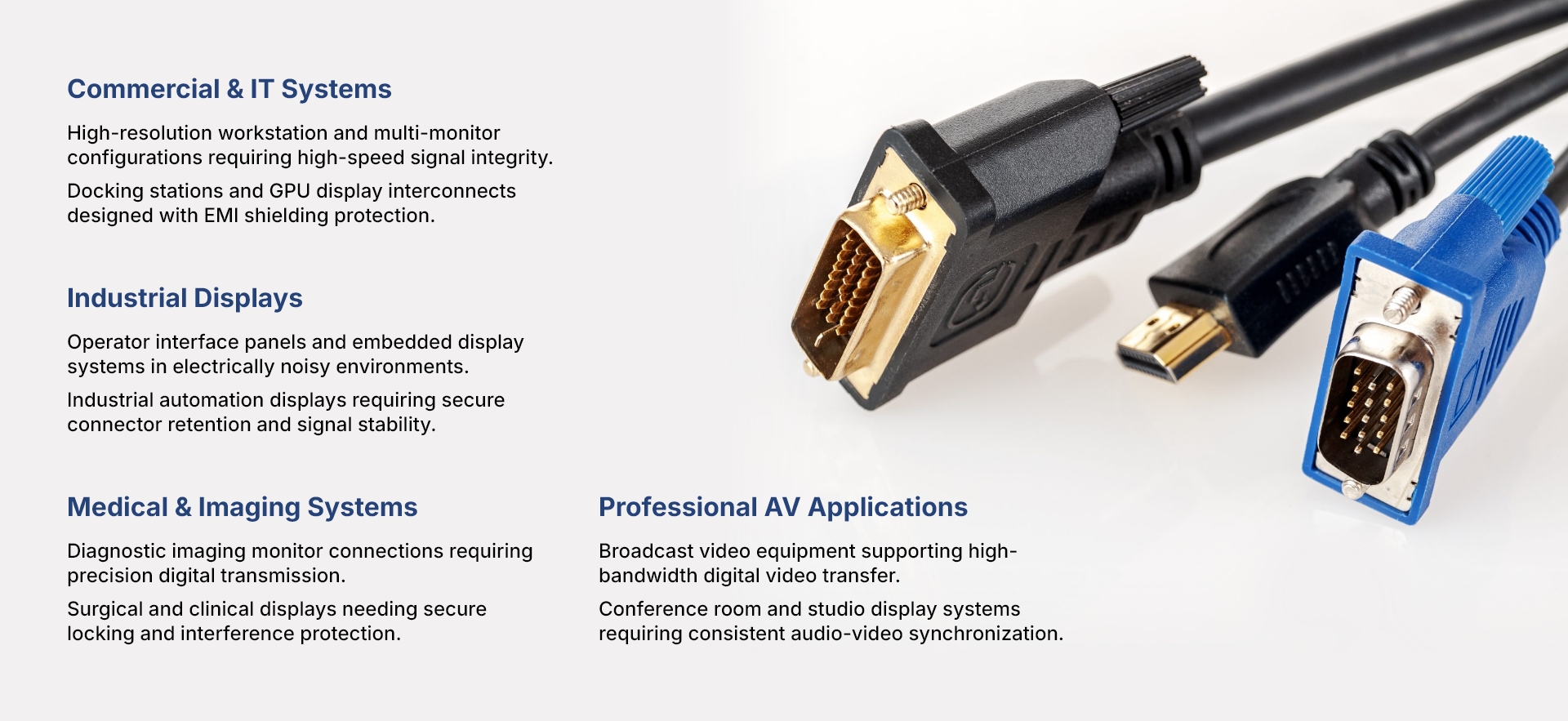 - Custom DisplayPort cable assemblies engineered for unique equipment designs