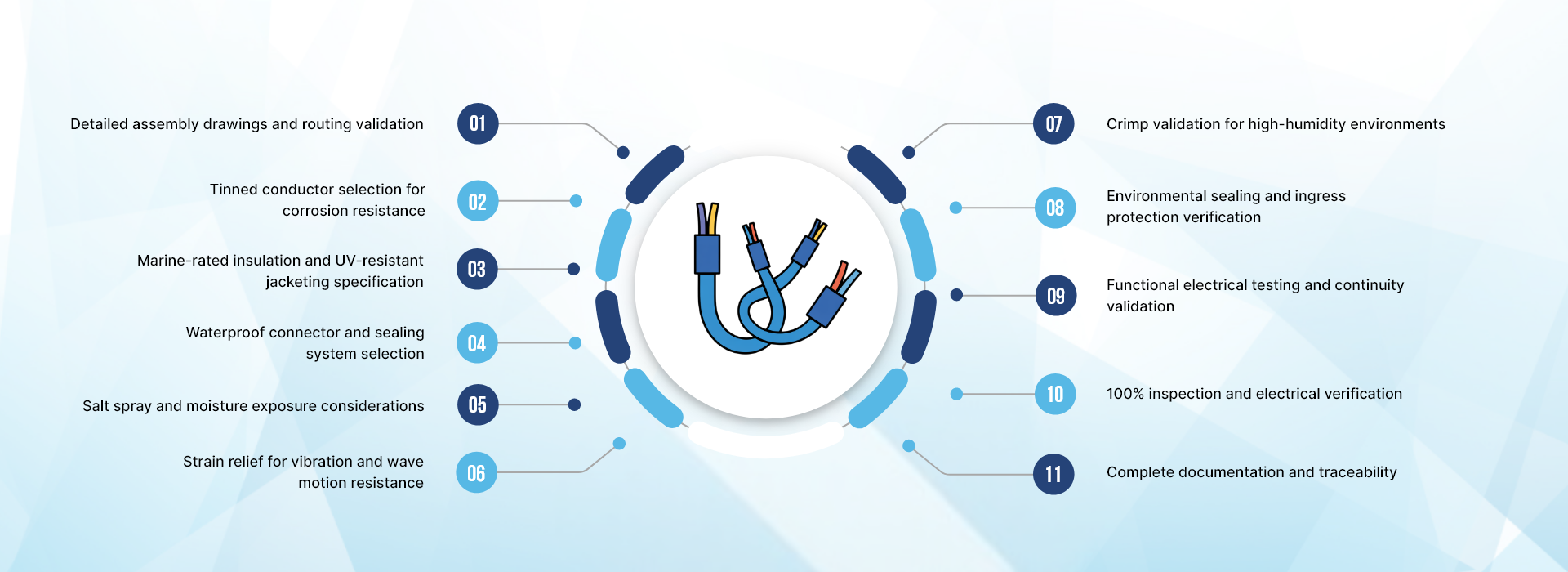 Our engineering and production teams ensure proper conductor selection, insulation and jacketing materials, connector performance, EMI/EMC protection, and assembly consistency for dependable marine power and signal transmission.